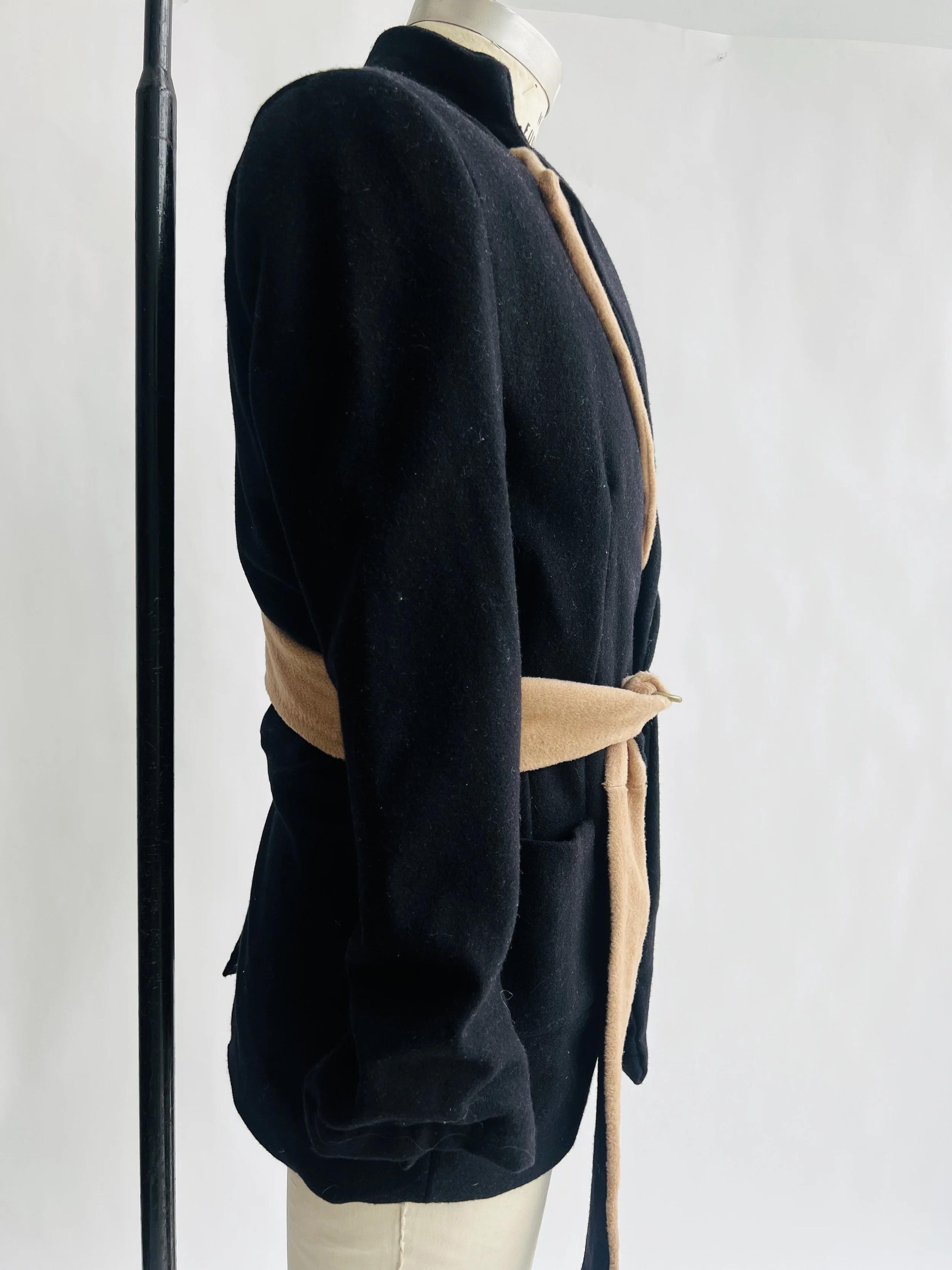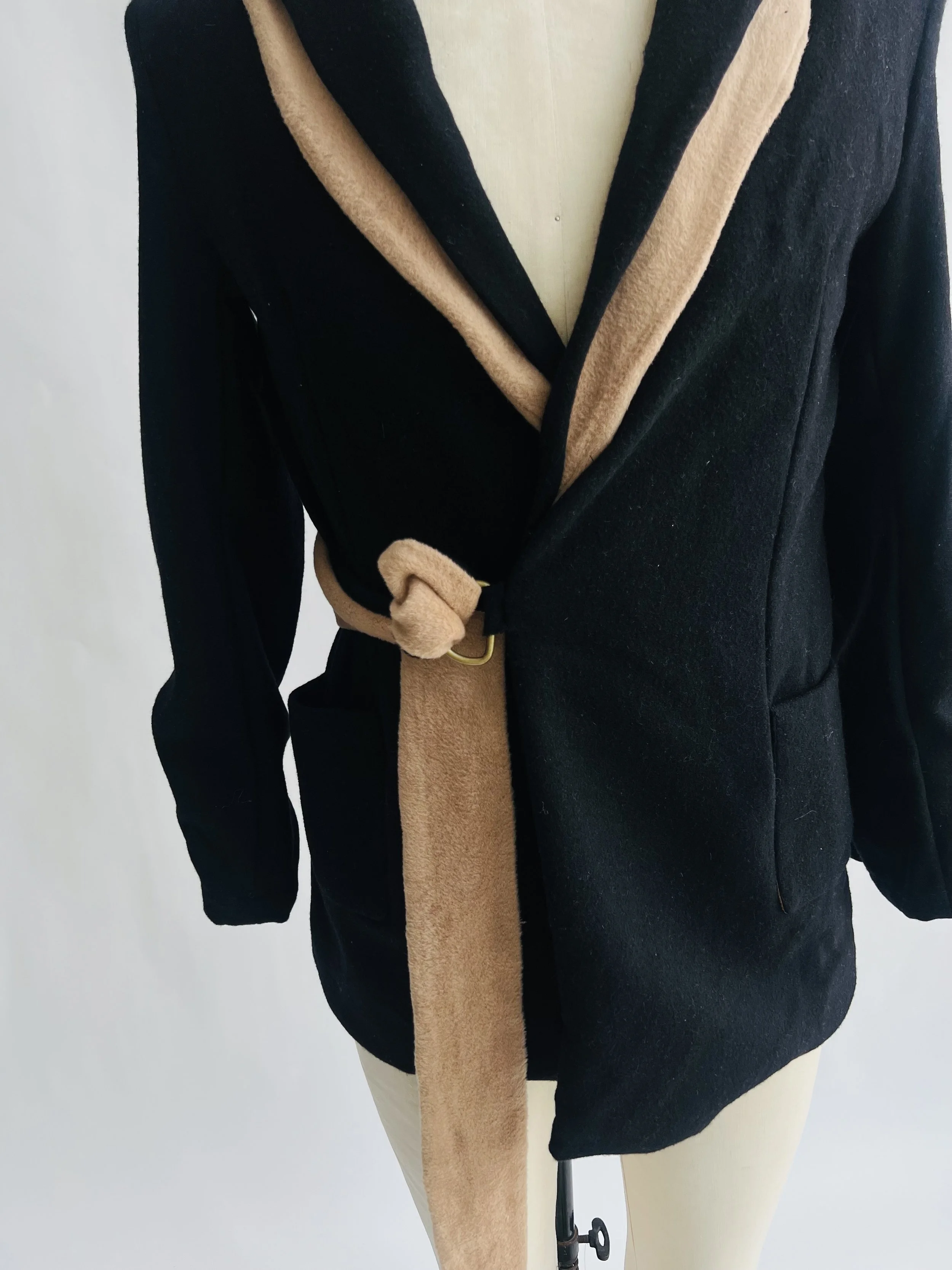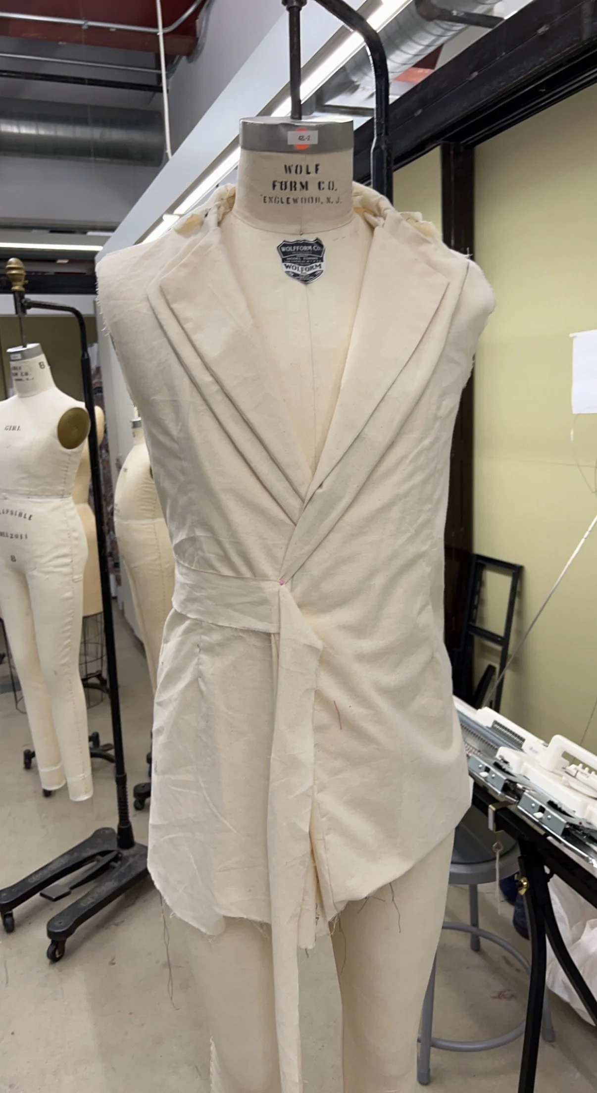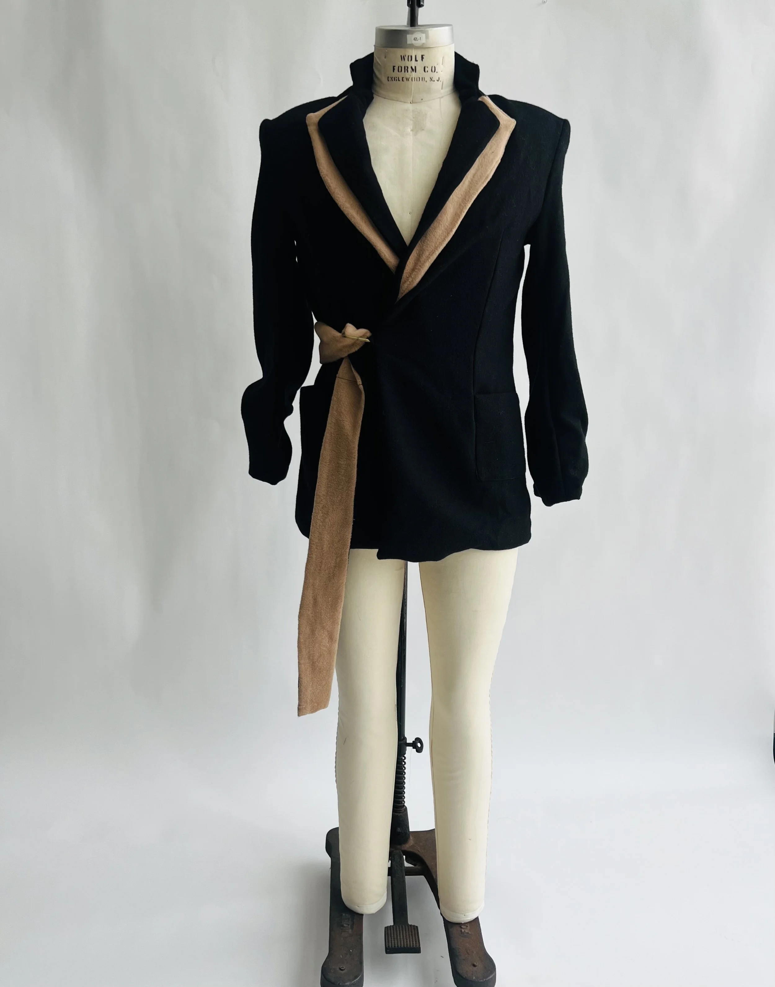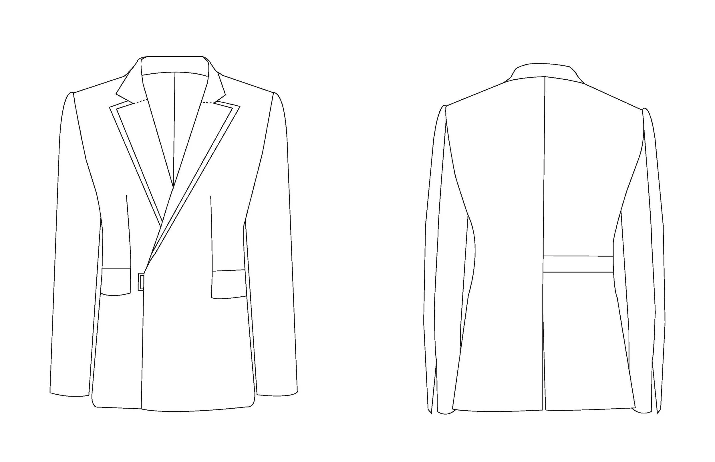 This project focused on traditional tailoring seen in menswear. Taking heavy inspiration from western society, such as cowboys, deserts, and more, this suit jacket offers a subtle twist to the standard menswear jacket, with broad shoulders, a wrapped closure, flat color, dual color lapel and pinches sleeves cuffs, this jacket aims to to bring. amore modern elegance and sleekness to the iconic suit jacket.